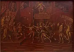 In 1520-1522, Leonbruno was commissioned by Isabella d'Este to decorate the interior vaulted ceiling of her apartment in the Corte Vecchia: the room where she lived as a widow after her husband's death in 1519.[4] The apartment was known as the Camera Grande, which subsequently became the name of his work on the interior ceiling; a vast ceiling fresco depicting scenes of hunting in lunettes encircling a central oculus portraying a fictional scene.[17] The fresco features exquisite gold and white stucco which frame thematic scenes from antiquity.[18] It has been said that this work was inspired by Andrea Mantegna's well-known earlier ceiling paintings in the Camera Picta.[19] The work still survives today, and the date of the decorations created by Leonbruno are mentioned in a document dating to 1522.[4][20][21]