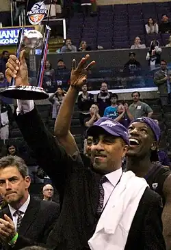 ![]() Romar celebrates Washington's 2011 Pac-10 tournament championship. | |