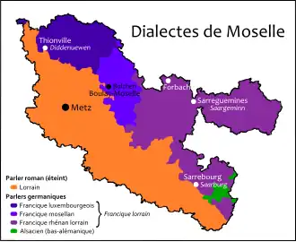 ![]() Dialects of Moselle. Those in purple areas are lumped under the term "Lorraine Franconian" when spoken in France. | |