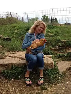 The Farm Sanctuary[2] was the first shelter for farm animals; created to protect and advocate for the rights of farm animals against the horrors of factory farming and mistreatment of animals. While doing research and observation at a stockyard in Lancaster, Pennsylvania, Houston came across a living sheep on a pile of dead carcasses.[3] She is now known as Hilda, and was immediately rescued by Houston and was taken to a veterinarian. It turned out that Hilda was perfectly healthy, but was discarded as a “downer” because she was unable to stand after enduring the brutal conditions of transportation from farm to factory. Unable to keep a sheep in her backyard forever, Houston started Farm Sanctuary with then-husband Gene Baur, and Hilda was their first rescued farm animal. Today, Farm Sanctuary houses over 400 rescued farm animals in three locations in the United States.[4] Houston left Farm Sanctuary in 2004 to begin the establishment of Animal Acres in 2005.