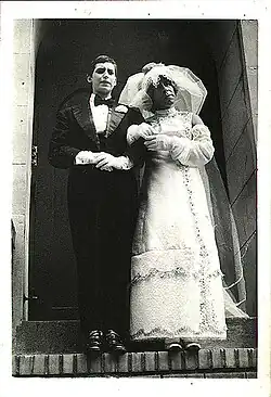 One member of this group even adopted Topo as his stage name. He later specialised in 'robotics' miming mechanical robots. Together with Jimini Hignett he formed his own fringe company 'Christians Lady Diana) they were married - he dressed as Diana, Jimini as Charles. At the wedding - dubbed ‘The Royal Drag’ by the Soho News - all guests are also cross-dressed (the Queen Mum sporting an enormous hairy back and a hat made from pizza boxes). The preacher at first refuses to conduct the ceremony, thinking they were both men. The event is shown on the Channel 7 TV-news.