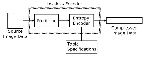 The main steps of lossless operation mode are depicted in Fig.2. In the process, the predictor combines up to three neighboring samples at A, B, and C shown in Fig.3 in order to produce a prediction of the sample value at the position labeled by X. The three neighboring samples must be already encoded samples. Any one of the predictors shown in the table below can be used to estimate the sample located at X.[4] Any one of the eight predictors listed in the table can be used. Note that selections 1, 2, and 3 are one-dimensional predictors and selections 4, 5, 6, and 7 are two-dimensional predictors. The first selection value in the table, zero, is only used for differential coding in the hierarchical mode of operation. Once all the samples are predicted, the differences between the samples can be obtained and entropy-coded in a lossless fashion using Huffman coding or arithmetic coding.