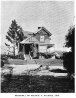 Locally known as Maxwell House it was designed by Clinton Day, a prominent Bay Area architect, who designed the City of Paris building in San Francisco, as well as several science and architecture buildings at UC Berkeley.[6][7][8] Its original owner was George Hebard Maxwell, a young lawyer and an up-and-coming Republican Party organizer.[8][9][10] Handling water access cases for small agricultural land owners, he became a proponent of water reclamation and communal irrigation projects. In 1896 he moved to Phoenix, Arizona to promote the reclamation issues on a national scale, became the co-author of the National Reclamation Act in 1902.[11][12] The Maxwell family sold their Piedmont mansion in 1903 to a real estate developer and his wife, Fred and Alice Clark, who owned the house for only several years, but during that time moved it further up hill, two blocks east to 2405 Prospect Street.[13] The house was resold several years later to a lumber millionaire O.S. Johnson.[13][14]