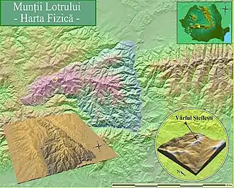 Lotru Mountains (Romanian: Munții Lotrului) are a group of mountains that are part of the Southern Carpathians mountain range, in southern Romania. The highest peak is Șteflești Peak at 2,242 metres (7,356 ft).