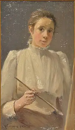 After schooling in Uddevalla and at Stockholm's Technical College (1880–1884), she studied at the Royal Academy from 1884 to 1890.[2] She went on to study first in France and then Italy where she remained for five years. Works from this period include Tvätterskor and Romerska Modeller. On returning to Stockholm, she painted some of her best works in the 1890s. These included miniature portraits, interiors, landscapes and still lifes. Here Swedish works included landscapes of the Väddö Canal, Visby and winter scenes. She also painted old farmhouses including Bakgården with a sunlit haystack and Gammalgård in Uddevalla.[3] One of the last works she exhibited was the miniature Bagnaia i sol (Bagnaia in the Sun), presented at the Women Artist's exhibition in 1911.[2]