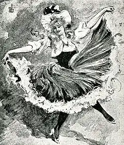 While touring in vaudeville in the United States she heard the song "Ta-ra-ra Boom-de-ay!"[11] After she sang it at the Tivoli Music Hall in London in November 1891, it became her signature piece. She would sing the first verse demurely and then launch into the chorus and an uninhibited and exhausting skirt dance with high kicks (especially on the word "BOOM") that exposed her stockings held up by sparkling garters, and bare thighs. She sang the song at performances of the Gaiety Theatre's burlesque Cinder Ellen up too Late beginning on 14 March 1892[12] and according to her obituary, at the height of the craze was performing it five times nightly at different venues in London.[13]