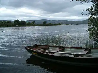 Lough Currane (Irish: Loch Luíoch),[2] also called Lough Leeagh, is a lake in County Kerry, Ireland. Waterville lies on its western bank, close to the Atlantic Ocean, it empties into Ballinskelligs Bay. The numerous townlands which lie on its southern bank, including Cappamore, Eightercua and Gortnamackanee, are collectively known as Glenmore. It covers an area of 2,500 acres (10 km2) and is 3.5 miles (5.6 km) long and 2 miles (3.2 km) at the widest point. The lake is notable for the Early Medieval monastery on Church Island.[3] It is associated with had the St. Finan Cam, who inhabited the island c. 7th century. To the south of the lake is Inis Uasal (Noble Island), an island dedicated to St. Finan. The Annals of Inisfallen mention that Amchad, the "anchorite of God" was buried on the island in 1058.[4]