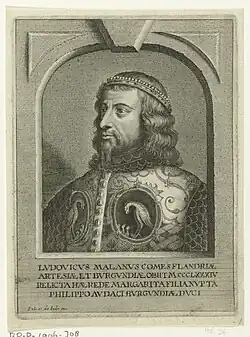 Becoming count after his father was killed at the Battle of Crécy (26 August), he broke with his father’s pro-French policies to adopt a stance closer to his subjects, skillfully navigating between the conflicting interests of the kings of France and England, who were in open war.[1] He ensured Flanders, despite the Black Death (1348), thirty years of relative peace and economic recovery (1349–1379), a period framed by two major revolts led by the weavers of Ghent.[1] With the support of Margaret of France, he prepared for the establishment of the House of Valois-Burgundy in the county of Flanders through his administrative reforms and the marriage of his only daughter, Margaret of Flanders.[1] She later married Philip the Bold.[1] This allowed for the return of Romance Flanders to the county.[1]