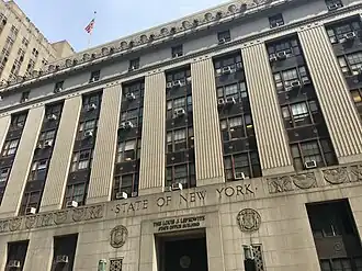 - ^ "NEW STATE BUILDING OPENS HERE MONDAY; Taxation and Finance Offices to Start Moving Into Civic Centre Structure Today. RENTS NEARLY ELIMINATED $6,500,000 Cost Is Below Estimate --Quarters of Motor Vehicle Bureau Resemble Bank". The New York Times. October 24, 1930. p. 25.
