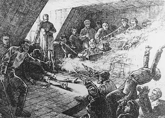 Shortly after, Vail learned from the hotel valet, Philias Thériault, that rioters were hiding in André Albert's house. The sheriff ordered his assistant, Stephen Gable, to lead a group of twenty men, including John Blackhall[27] who serves as an interpreter, to storm the house. It was three o'clock in the afternoon. Blackhall questioned André Albert, who denies the presence of rioters. Meanwhile, Stephen Gable and some men entered the house while the others remained outside to prevent the occupants from escaping. A constable pointed his rifle at Clothilde as she got up to remove boiling water from the stove, causing her to faint. The two women were then taken to a nearby room. A noise from the second floor caught Robert Ramsay's attention, prompting him to fire a warning shot into the ceiling to "scare those hiding there." Richard Sewell reacted, exclaiming, "The sons of bitches are up there!" and rushed to the attic with Henry Burbridge. The occupants blocked their entry. In response, other constables attempted to remove the ceiling planks with their rifles. Two shots were fired from the attic, but no one was injured.[38]