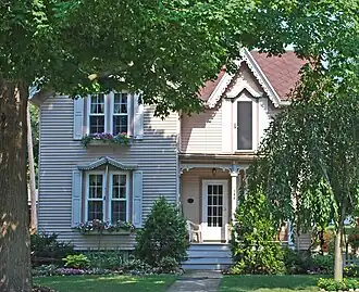 The Louis Sturm House is an L-shaped two-story frame house with Gothic Revival detailing, including a steeply pitched roof and dormer, peaked window trim and pointed-arch eave- line trim. It has a one-story rear garage addition and front and side porches with brackets and trim at the eaves.[2]