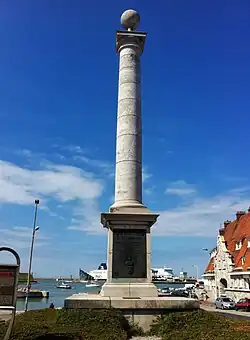 After the fall of the First French Empire, Louis XVIII, solicited by a delegation from the town council to return to France via Calais, accepted because "it was the shortest way and he was in a hurry to get back home". The monument set up with his agreement in memory of his landing of 24 April 1814 bears a bronze plaque of the royal foot print and a commemorative text. Declared a historic monument in 1933 the column was removed in 1939 so as not to impede work on the port and was thus saved from destruction. Formed as stone blocks one above the other, it left its former site on the quay to be erected in 1965 at its current spot in the Courgain area of the city.[1]