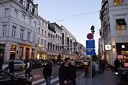 At the end of the 1990s, the JNC International SA office, as part of the chemin de la ville project, studied the redevelopment of public spaces on the Avenue Louise, with the installation of new sculptures and lighting, and the redesign of pavements and surface parking areas.[27] In spite of this, much of the post-war configuration still exists today. It implies that no metro line runs through the avenue, despite its high built density and its multiple functions of shops/offices/housing,[28] the latter being in a way replaced by these tunnels. However, tram lines 8 and 93 operate on their own site from the Place Stéphanie to the Woluwe depot.