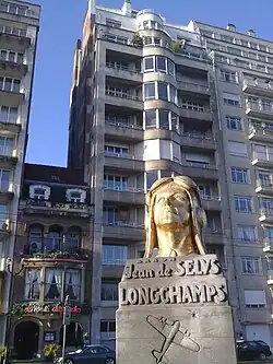On 20 January 1943, Baron Jean de Sélys Longchamps, a Brussels-born fighter pilot in the Royal Air Force, mounted a solo attack on the headquarters at number 453.[19] Benefitting from the wide avenues, and the large height of the apartment block relative to the neighbouring buildings, he flew his Hawker Typhoon at a low altitude straight towards the building, firing the plane's 20 mm cannons, before returning to England.[19] Following this attack, the SD moved their headquarters to number 347.[17] The cellars at this address were used to detain and interrogate captured members of the Belgian Resistance.[20] The torture that took place there brought the Avenue Louise's name considerable infamy at the time.[21] A monument to Baron de Selys Longchamps now stands in front of number 453.[22]