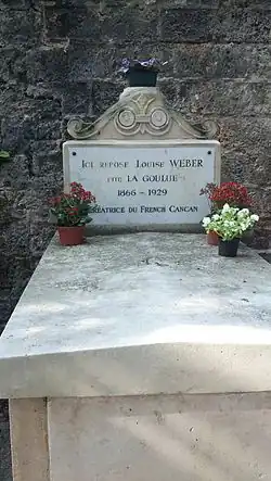 Alcoholic and destitute, La Goulue returned to Montmartre in 1928.[18] She eked out a living selling peanuts, cigarettes, and matches on a street corner near the Moulin Rouge; few recognized the severely overweight and haggard former Queen of Montmartre. She died a year later at age 62 in the 10th arrondissement of Paris and was buried in the Cimetière de Pantin in the Paris suburb of Pantin, but later her remains were transferred to the Cimetière de Montmartre.[19][20]