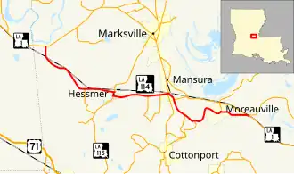From the west, LA 114 begins at a T-intersection with LA 1 at the Red River in western Avoyelles Parish. This junction is located 1.6 miles (2.6 km) east of Echo, a small community in neighboring Rapides Parish and 2.9 miles (4.7 km) southwest of Fifth Ward. LA 114 crosses the Kansas City Southern Railway (KCS) at grade then follows the rail line southeast through a rural area known as Belle d'Eau. Here, the highway crosses Choctaw Bayou just outside the Grand Cote National Wildlife Refuge. After curving due east, LA 114 intersects LA 1188, which connects to LA 115 south of Hessmer. LA 114 continues into the village of Hessmer on West School Street and intersects LA 115 (Main Street), which connects to the nearby cities of Marksville and Bunkie. LA 114 turns south, running briefly concurrent with LA 115, before resuming an eastward course along East Main Street. Exiting Hessmer, LA 114 proceeds a short distance into the larger town of Mansura, where it becomes known as Baton Rouge Avenue.[2][3][4][5]