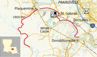 The only other significant change to LA 75 occurred in 1965 when the highway was re-routed through the Plaquemine area.[12][14] LA 75 originally followed what is now LA 3066, weaving into town alongside Bayou Plaquemine. This alignment was bypassed by an extension of former LA 992-2, and the Mississippi River ferry was moved downstream from its previous location at Court Street accordingly.[15]