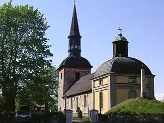 The runestone was located outside of the church's weapons house in the 17th century, and was covered with earth when the weapons house was demolished in 1798.[1] The runestone was uncovered in 1935 during restoration work at the church and it was then placed in its present position.[1]