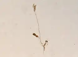 Lovenella gracilis are colonial animals that form erect colonies,[1] on hard surfaces using a hydrorhiza, stem-like structure, and reach a maximum height of around 2.3 mm.[2] The polyp is the dominant stage of the L. gracilis. They are trophosome with thin hydrocaulus that branch out alternatively to form the hydrotheca. At the end of each branch there is a conical operculum that consists of eight pieces. This structure also contains ten to twelve tentacles equipped with nematocysts that can be used in self-defense or to capture their prey.[3]