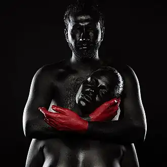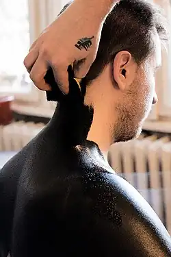 Painting the human body in black is also employed in low-key photography using non-toxic dyes or pigments in order to darken and enhance as much as possible the colour of the subjects photographed, and to achieve the desired effects.[68] In order to achieve the effect of reflection of light that creates a white contour of the painted body, as well as a high contrast between black and white, various dyes mixed with body creams are used. These usually include henna, tempera or acrylic paint. Liquid latex, which is composed of natural latex and dyes, is also used with caution to avoid stopping the skin to breathe.[76][77]