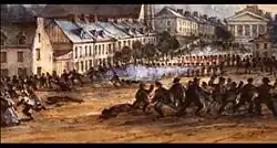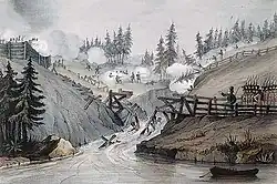 Government troops soon beat back the rebels, defeating them at Saint-Charles on November 25 and at Saint-Eustache on December 14, burning a rebel outpost after their second victory. On December 5, the government declared martial law in Montreal. At the Battle of Saint-Charles, the Patriotes were defeated. General Brown was confident but was not a capable commander. There was no discipline in the camp. Different people offered him men, but he turned down all the offers. Once the battle started, Brown escaped the fight. After the Battle of Saint-Charles, Nelson tried to keep Saint-Denis safe, but knew there was no hope. The main leaders, including Papineau, O'Callaghan, and Nelson, left for the United States.[3] The last battle of the rebellions was the Battle of Saint-Eustache. When the battle came, on December 14, 1837, there were between 500 and 600 people ready to fight. The government forces were expecting strong resistance and so had brought 2,000 men. Most Patriote leaders were killed or fled during the battle. The Battle of Saint-Eustache was a significant defeat. The defeat of the rebellions can be explained by the fact that the Patriotes were not quite ready to fight.[3]