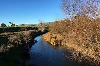 The creek currently drains an area of over 43 square miles (110 km2) with its source in the Edenvalle Hills of southeast San Jose, California.[6] Upper Silver Creek and Thompson Creek both begin in the Edenvale Hills, and historically sank into the alluvial basin of Evergreen Valley in southeast San Jose. Then they resurfaced and flowed into a large freshwater marsh known historically as Laguna Socayre, and referred to more recently as Silver Creek Marsh.[7] In 1978, Silver Creek Marsh was excavated into a flood water detention pond or reservoir, now known as Lake Cunningham.[6] Thus, Lower Silver Creek used to begin southwest of where Lake Cunningham is today, but now its source is regarded as just north of this artificial lake by the Santa Clara Valley Water District (now Valley Water) at the confluence of Thompson Creek and Flint Creek. In the 1970s, Upper Silver Creek flows were shunted due west into a flood control channel discharging directly to Coyote Creek south of Singleton Road.[8]