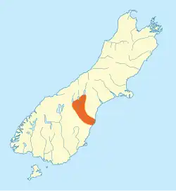 Approximate known distribution (in orange) of the lowland longjaw galaxias on a map of the South Island