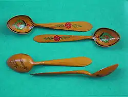 Spoons are often used in ethnic Russian music and are known as lozhki (Russian: Ло́жки [plural]; Pronunciation: ⓘ [singular]). The use of spoons for music dating at least from the 18th century (and probably older).[1] Typically, three or more wooden spoons are used. The convex surfaces of the bowls are struck together in different ways. For example, two spoons are held by their handles in the left hand, and the third, held in the right hand, is used to hit the two spoons in the left hand. The hit, in a sliding motion, produces a typical sound.[2][3] One can also hold three spoons in the left hand and put a fourth into the bot or the pocket. A fifth spoon is then held in the right hand and used to hit the other four. Finally, one can hold the bowl of a single spoon in the left hand and hit it with another spoon. In this style, different sounds can be emitted by holding the bowl more or less tightly.
