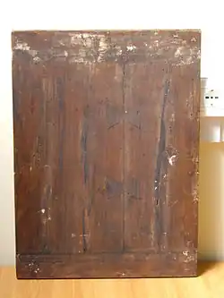 The panel is constructed of two main vertical sections of wood of irregular width and joined with two inset butterfly joints. There are narrow horizontal sections of timber at the top and bottom of the panel. These sections have half-lapped mitre joints to the verticals, visible at the front of the panel. The rear of the panel has the words "PINXIT MEA" painted on it. It is written in Roman capital letters, in "mirror writing" so that the whole inscription is reversed and reads from right to left. The inscription runs down the left side of the reverse of the painting, rather than across it.