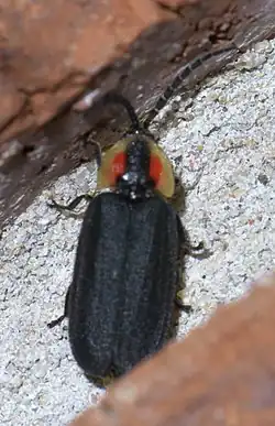 Adult body length is 9 to 12 mm (0.35 to 0.47 in).[8] This firefly has segmented, conspicuous, black antennae that are serrate,[9]: 84 with males having larger antennae.[10] The pronotum extends over the head and is usually red and yellow with a medial black stripe or patch,[8] but may be dark overall in some individuals.[11] The compound eyes are smaller than those of nocturnal species like Photinus pyralis.[12] The elytra are black or brown-black[8] and have granulated texture.[11] The light organ is greatly reduced and difficult to discern in the adult.[9]: 30 [10][13]