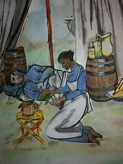In late June 1862, Lucy, her daughter Mona, and some other slaves escaped from Grays Creek, Tennessee, crossed the Hatchie River, and eventually arrived at the Union lines that were at the fairgrounds near Bolivar, Tennessee, almost thirty miles away. Major Shadrack Hooper of the 23rd Indiana Infantry Regiment, who recorded all of their battles as adjutant, reported her joining their regiment, and described her character as someone having integrity, honesty, intelligence, always smiling, cheerful and kind, a willing washerwoman, seamstress, nurse, cook, and singer, as well as a "rattling good forager".[2][3] Other soldiers, and the regiment surgeon, Magnus Brucker, described her as a faithful nurse.[4]