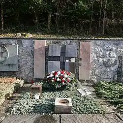 He found his final resting place at the Vaduz cemetery next to his parents and his older sister Isabella (1887-1935). His wife, his son Peter and Peter's son Ludwig (1962-2006), who also became a lawyer and crime writer, were later buried in the family grave as well.