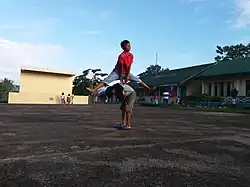 At the start of the game, one player is designated taya (it), or in this game the bakang lala (cow). The players should avoid touching or falling over the baka player while jumping over. The baka player should start with a kneeling-down position (a baka player bends over with their hands placed on his knees). All players are to jump over the baka until all the players have jumped.[3] Once the first set of jumping over the baka is done, the baka player will slowly rise up after jumping over the baka player. Only the hands of the jumper may touch the back of the person who is bent over. If a player fails to avoid contact or fall over the baka, they will replace the baka player with a kneeling position (step 3), and the game continues until the all players decide to end the game.[4][5]
