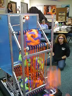 "Vomit" bots, also called "power dumpers",[7] were a hybrid between the shooter and the dumper. They were often the best robots, combining the accuracy of the shooter with the massive scoring of the dumper.[7] These robots would drive up to an opponent's trailer and "vomit" a stream of balls into the trailer,[7] (often as many as 10 or more at once). Many were self reloading, and were the rarest type of robot.