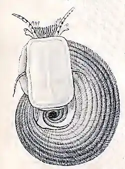 The oval operculum is flat within, with four whorls. Its nucleus is situated one-third the distance across the face. Its outside is white, excavated at the center, with two strong spiral ribs, the inner one decidedly the stronger. It shows a sharply granular tract outside the outer rib.[2]
