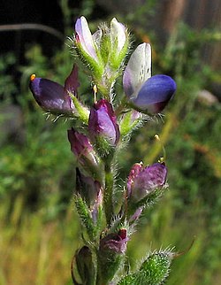 Lupinus concinnus is a species of lupine known by the common name Bajada lupine. It is native to the southwestern United States from California to Texas, and northern Mexico, where it is known from many types of habitat. This is a hairy erect or decumbent annual herb with a stem growing 10 to 30 centimeters long. Each small palmate leaf is made up of 5 to 9 leaflets up to 3 centimeters long and under a centimeter wide, sometimes narrow and linear in shape. The inflorescence is a dense spiral of flowers, with some flowers also appearing in leaf axils lower on the plant. Each flower is 5 to 12 millimeters long and purple, pink, or nearly white in color. The fruit is a hairy legume pod around a centimeter long.
