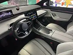The passenger cabin has an oval steering wheel and a raised digital instrument cluster screen. The central touchscreen has a diagonal of 12.3 inches. Huawei was responsible, among others, for: for providing the HarmonyOS multimedia system, as well as the extensive ADS 2.0 semi-autonomous driving system supported by LiDAR placed at the edge of the windshield, as well as side cameras scanning the surroundings.[4]