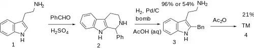 The Pictet–Spengler reaction between tryptamine [61-54-1] (1) and benzaldehyde gives 1-Phenyl-tetrahydrocarboline [3790-45-2] (2). Catalytic hydrogenation leads to 2-Benzyltryptamine [22294-23-1] (3). Acylation with acetic anhydride only gave 21% yield of Luzindole (4).