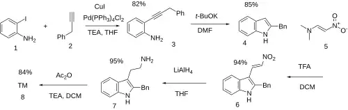 ^ Righi, Marika; Topi, Francesca; Bartolucci, Silvia; Bedini, Annalida; Piersanti, Giovanni; Spadoni, Gilberto (2012). "Synthesis of Tryptamine Derivatives via a Direct, One-Pot Reductive Alkylation of Indoles". The Journal of Organic Chemistry. 77 (14): 6351–6357. doi:10.1021/jo3010028.
