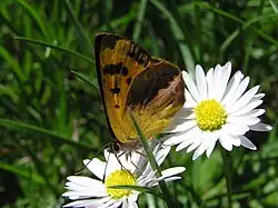 All Copper butterfly's population density suffers from Wasp predation (paper wasps mostly) as, for the wasp's larvae, they are a good source of protein. In its larvae stage, there have been reports of parasitism from certain types of Ichneumonids (Gibbs 1961).[4] The larvae kill the host by feeding either internally or externally while they are getting ready to pupate (Hawkinson 2005). Further studies of this species are needed to have concrete observations.