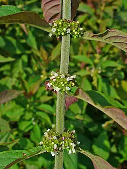 This is a perennial herb with a hairy, squared stem reaching a meter tall. The oppositely arranged leaves have oval to lance-shaped blades with toothed edges.[4][5] The leaves are dark green or purple.[3] Clusters of tiny white or pink-tinged flowers occur in the leaf axils.[4][5] The plant has a mint scent and a bitter taste.[3] This species can be easily confused with Lycopus uniflorus. The latter has stamens exserted from the flowers, while the stamens of L. virginicus are included. The two species may hybridize, producing Lycopus × sherardii.[5]