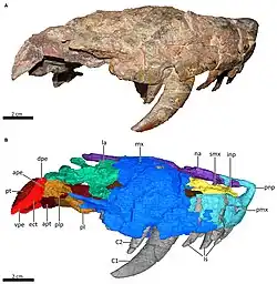 - ^ a b c d Kammerer, C. E. (2023). "Revision of the Scylacosauridae (Therapsida: Therocephalia)". Palaeontologia africana. 56: 51–87. ISSN 2410-4418.