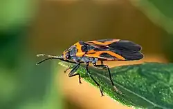 The false milkweed bug is widely distributed across the eastern United States and Canada.[5] It primarily feeds on the seeds of false sunflower, Heliopsis helianthoides.[6] The false milkweed bug is commonly confused with other black and red or orange insects, including Oncopeltus fasciatus, Lygaeus kalmii, and Lygaeus reclivatus.[5]