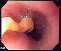 Food bolus impaction is a common complication of lymphocytic esophagitis.[1] This occurs when food is acutely obstructing the esophagus at an area of narrowing and may require an endoscopic procedure in order to remove or dislodge the obstructing food.