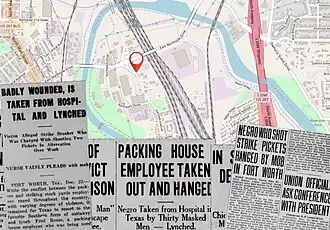 In 1921, the whites-only union workers at the Swift & Co. meatpacking plant in the Niles City Stockyards (now part of Fort Worth) went on strike. The owners attempted to replace them with black strikebreakers. During union protests, African-American worker Fred Rouse was accosted by some of the strikers, and he was stabbed in the back with a knife.[1] This resulted in Rouse firing his gun, wounding two white strikers who happened to be brothers. At this point, Rouse was clobbered, disarmed, and taken into custody by a Niles City policeman. Once Rouse was disarmed, the mob pried Rouse away from the policeman.[2] Rouse attempted to escape, but was refused entrance onto a streetcar. The mob then beat Rouse into "insensibility," and when he appeared to have perished, the mob allowed the police to recover Rouse's body and place it in a police wagon. The wagon made its way toward the morgue, but Rouse miraculously regained consciousness and was taken to the "Negro Ward" at the City & County Hospital (330 E. 4th St.).[3]