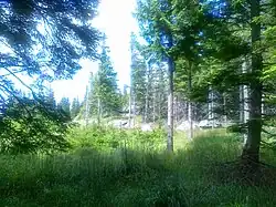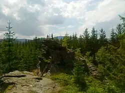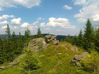 The main summit of Lyra has no marked tourist trail leading to it.[3] However, a main path runs through the summit area, traversing a nearly flat ridge through a forest clearing.[6] The summit itself is located on a rock formation about 125 metres long,[8] surrounded by spruce forest[5] and covered with a very common plant found throughout the Hrubý Jeseník area, namely European blueberry.[9] The summit rock formation serves as a viewpoint offering vistas of mountains such as Praděd,[10] Vysoká hole, Petrovy kameny, and Žárový vrch.[3]