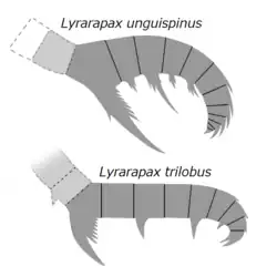 L. trilobus is quite similar, although somewhat smaller, with its H-element having a rimmed margin. The frontal appendages are quite different, with the very presence of endites being alternating (the third and fifth non-shaft podomeres lack them altogether) and the second endite being especially large. Contrary to its initial description reporting an unusual wrinkled structure around the mouth, Lyrarapax possessed a typical radiodontan oral cone, a radial mouth with four large plates and smalller, thinner plates between them.[4] The first flap in this species is not much wider than the rest, unlike in L. unguispinus, alongside the flaps having transverse lines interpreted as strengthening rays, another trait unique to this species. The trunk is divided into three lobes (giving this species its name) by prominent furrows, with the central region being more raised than the lateral ones.[2]
