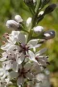 Lysimachia ephemerum, the willow-leaved loosestrife or milky loosestrife,[1] is a species of flowering plant in the primrose family Primulaceae, native to France, Spain, Portugal and Morocco.[2] Against grey-green foliage this hardy herbaceous perennial bears erect racemes of delicate white flowers with purple stamens on 1 m (3.3 ft) stems in early summer. It is cultivated as an ornamental plant, and holds the Royal Horticultural Society's Award of Garden Merit.[3] It requires a position in full sun, and reliably moist soil.