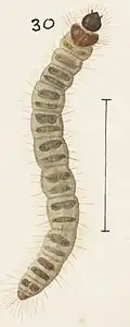 Its length when full-grown is about 1 inch. The head is bright reddish-brown; the second segment horny polished yellowish-brown; segments 3 and 4 are greyish-ochreous with a single row of minute warts and long bristles; the rest of the body is dull whitish-ochreous; each segment, except the last, having two elongate dorsal plates and five minute greyish lateral plates; the dorsal plates each have two warts and the lateral plates one wart, every wart emitting a long bristle; the terminal segment is dull brown with many bristles. The pupa is enclosed in a loose cocoon of silk and frass amongst the decayed wood.[6]