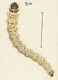 The length of the full-grown larva is about 1 inch. Cylindrical, thickest immediately behind segment 2, otherwise slightly tapering posteriorly. Head shining, deep reddish-brown; plate of segment 2 reddish-brown, darker posteriorly, base of head showing through as two dark lunate marks. General colour of segments 3 and 4 pale ochreous; rest of body pale dull brownishochreous; segments 11 and 12 a little brighter; segments 3 and 4 with elongate dorsal and roundish lateral horny plates, segments 5-12 with four conspicuous dorsal and four or five much smaller lateral horny plates; segment 13 with single series of plates; segment 14 minute with horny dorsal plate and several long bristles; each horny plate on other segments emits a long slender bristle.[7]